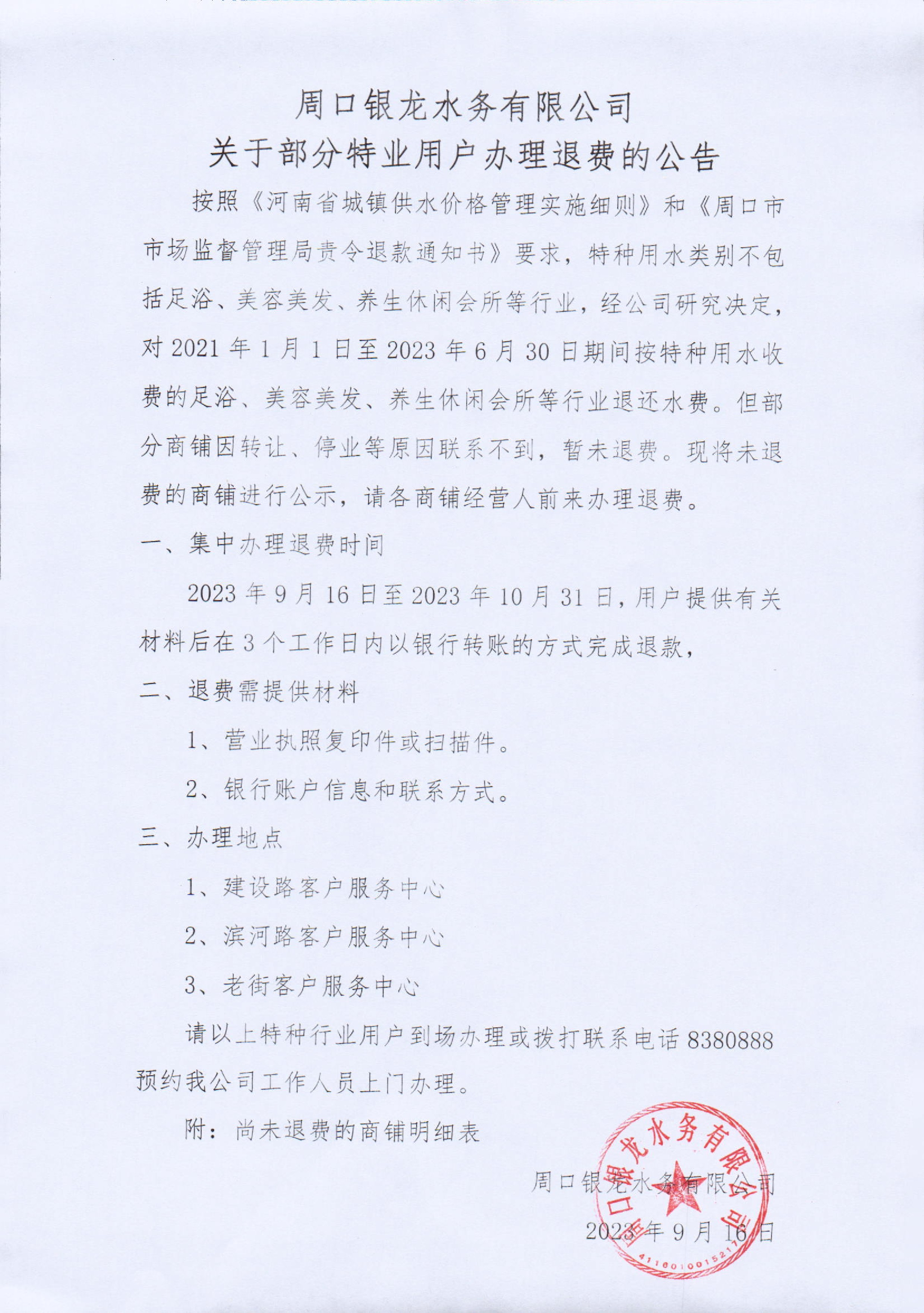 周口銀龍水務(wù)有限公司關(guān)于部分特業(yè)用戶辦理退費(fèi)的公告按照《河南省城鎮(zhèn)供水價格管理實施細(xì)則》和《周口市市場監(jiān)督管理局責(zé)令退款通知書》要求,特種用水類別不包括足浴、美容美發(fā)、養(yǎng)生休閑會所等行業(yè),經(jīng)公司研究決定...